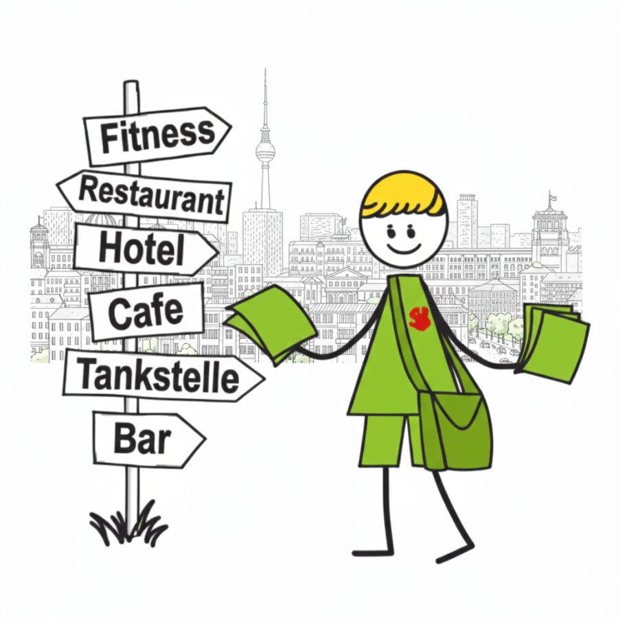 Maximale Zielgruppenansprache: Sie bestimmen die Lokationen – wir liefern Ihre Flyer in die passenden Restaurants, Bars, Fitnessstudios, Shops, Tankstellen, Kosmetikstudios oder andere relevante Hotspots.